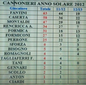 A chiusura dell’intervento di oggi abbiamo pubblicato in cima all’articolo la classifica marcatori dell’anno solare 2012, classifica che per la seconda volta consecutiva viene vinta da Andrea Fantini.