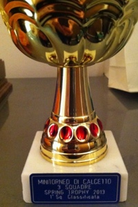Ecco il trofeo messo in palio per la vincitrice dello Spring Trophy. Lunedì 24 Giugno Olympic e Mo’viola si affronteranno in una sorta di finale in cui però i gialloblù dovranno vincere con due reti di scarto per portarsi avanti negli scontri diretti. Ma non è finita qui perché anche se riuscisse in questa piccola impresa poi l’Olympic dovrebbe battere lo Scarsenal nell’ultimissima giornata del mini torneo.