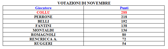Il calciatore del mese di novembre è Valerio Collu che è stato eletto con la stragrande maggioranza dei voti. Seguono Perrone e Belli, i due portieri, mentre Fantini e Montaldi occupano rispettivamente la quarta e quinta posizione con pochissimi voti di distanza.