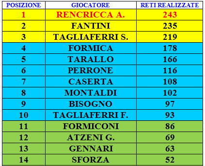 Le ultime Classifica cannonieri di tutti i tempi 13 dicembre 2013 olympic1989 Lascia un commento Di seguito riportiamo la classifica cannonieri di tutti i tempi in gare ufficiali (escluse quindi le amichevoli). La top 14 dei gol ufficiali Gli altri giocatori attualmente attivi nella rosa sono: RUGGERI: 17 COLLU: 15 LI CAUSI: 5 ROMAGNOLI: 4 Vota:Condividi:Mi piace Caricamento...