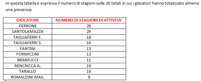 Sono ancora presenti molti giocatori del passato e ormai ritirati mentre tra quelli attivi troviamo Perrone, Formiconi, Rencricca e Fantini.