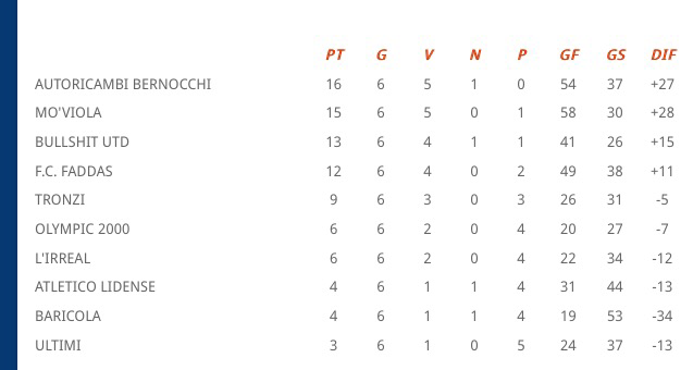 Dietro a queste due grandissime formazioni c’è il Bullshit che ha battuto l’Olympic 2000 e ha superato l’F.C. Faddas, sconfitto a sorpresa dall’Atletico Lidense. Bella anche la gara tra i neri e i gialloblù con quest’ultimi che passavano in vantaggio con Rencricca su calcio di rigore al quinto minuto. Il Bullshit pareggiava anch’esso su penalty due minuti dopo con Battista e passava in vantaggio con Morelli dopo un altro giro di lancette. Il primo tempo finiva sul 3 a 1 con il Bullshit che approfittava di un’Olympic statica e senza idee in avanti. Nella ripresa le idee arrivavano ed era Alexander Ruggeri a dare grandi grattacapi agli avversari segnando un gol e mettendo a dura prova la solidità difensiva del Bullshit che però reggeva bene. A metà ripresa Formiconi colpiva un palo clamoroso e dal possibile 3 a 3 si passava al 4 a 2 grazie ad un contropiede concluso Morelli. Nel finale Piredda concludeva l’opera con una doppietta fino al 6 a 2 finale. Complimenti al Bullshit che raggiunge quota tredici punti e che nonostante alti e bassi è sempre un team pericoloso come un toro durante una corrida. Battista, Piredda e Morelli sono un tridente ben assortito e c’è chi pensa di comprarlo in blocco per arricchire l’attacco della Roma per esempio. Chissà se a gennaio li vedremo in giallorosso e magari nel Bullshit giocare Iago Falque, Salah e Dzeko! Per l’Olympic questo campionato è tutto un paradosso: il grande problema è l’attacco che con solo 20 reti realizzate e il peggiore del torneo. La difesa invece è la seconda migliore del campionato e rimane un ottimo punto di partenza su cui lavorare.