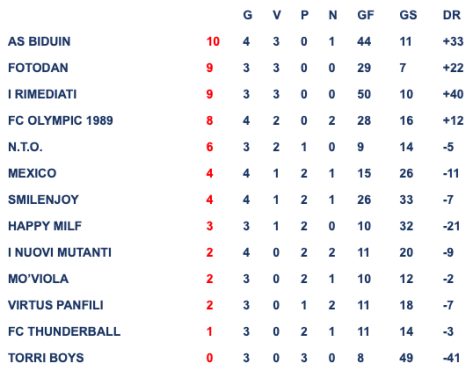 AS Biduin conduce la classifica con 10 punti inseguita da Foto Dan e Rimediati che hanno una partita in meno. L’Olympic è in terza posizione ed è tra le quattro formazioni imbattute del torneo.