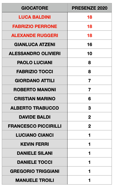 Vincono il trofeo Luca Baldini, Fabrizio Perrone e Alexander Ruggeri che hanno collezionato 18 presenze e che quindi si spartiscono il premio. Il quintetto ideale dell’anno include anche Gianluca Atzeni e Alessandro Olivieri che si posizionano rispettivamente al quarto e al quinto posto.
