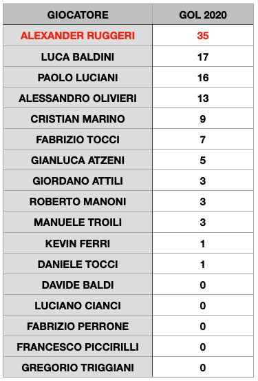 Ecco ci al secondo appuntamento con i premi dell’anno solare 2020. Ieri Luca Baldini, Fabrizio Perrone e Alexander Ruggeri sono stati premiati come i più presenti dell’anno mentre oggi assegniamo il trofeo al miglior marcatore dell’anno.