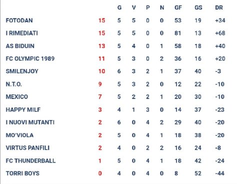 Il Foto Dan veleggia a punteggio pieno a braccetto con i Rimediati con cinque vittorie in cinque gare. Insegue l’AS Biduin con 13 punti mentre la nostra Olympic è quarta con 11 punti. Le prime quattro in classifica hanno tutte cinque gare giocate e sono anche le uniche formazioni finora imbattute in campionato. In coda invece Mo’viola, Virtus Panfili, Thunderball e Torri Boys non hanno mai vinto nemmeno una sfida. Per ciò che riguarda la classifica cannonieri in cima c’è Zino dell’AS Biduin che guida per distacco la graduatoria con ben 30 reti alla media di 6 segnature a gara.