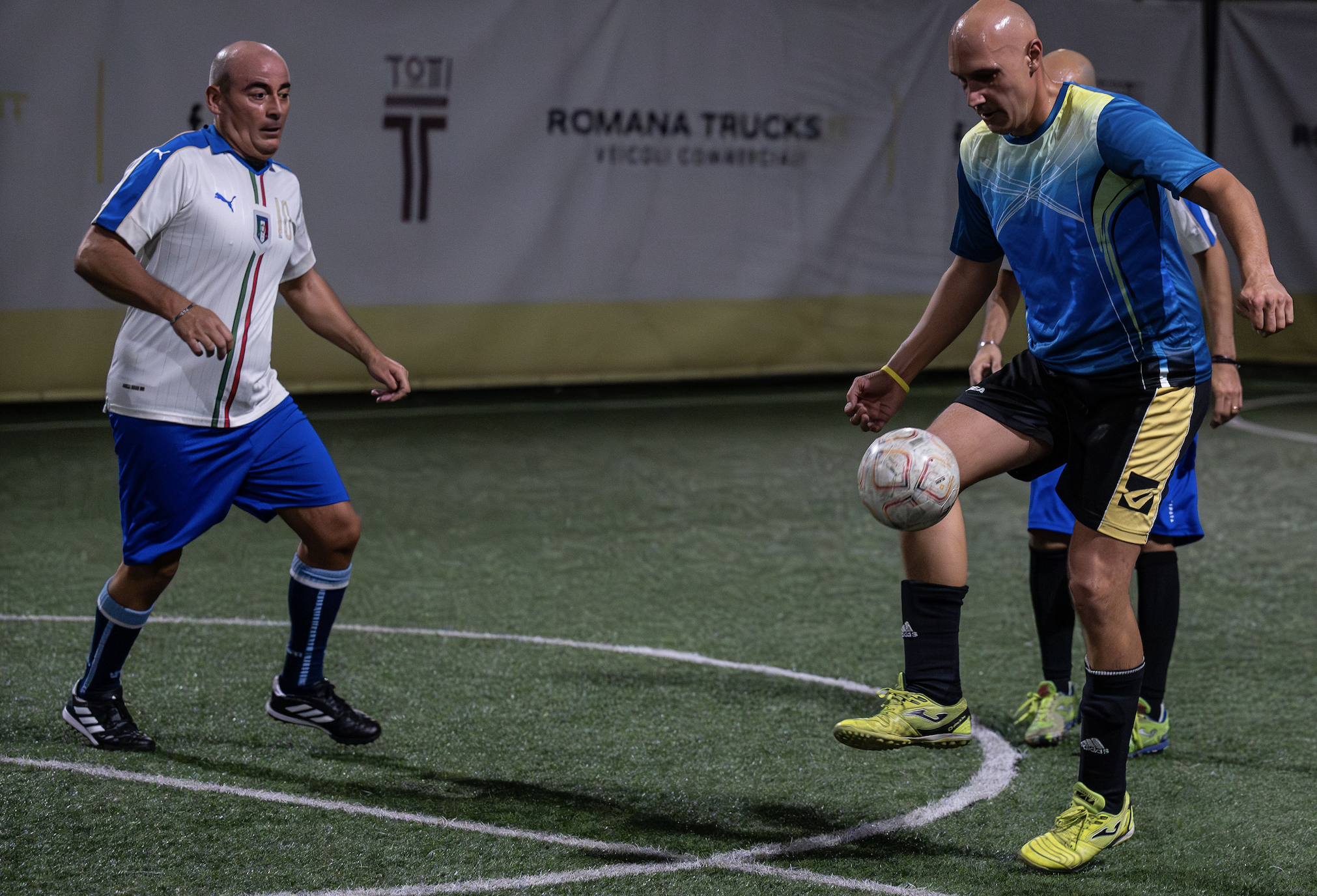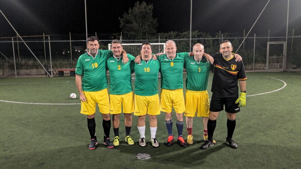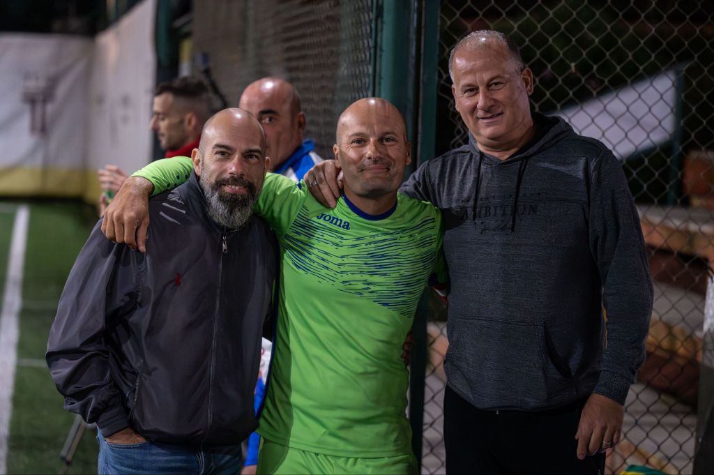 Cominciano ad arrivare i giocatori. Per primo Gianluca Bisogno, che stasera ritorna in campo dopo due anni dichiarando che sarà la serata del suo addio al calcio. Poi l’esordiente Giulio Luciani e ancora i titolari come Simone Montaldi e Alessandro Pizzoni e per ultimi Fabrizio Formiconi (dopo ventinove anni di militanza ancora una volta direttamente al campo senza passare per gli spogliatoi) e Federico Perrone, figlio del capitano, troppo giovane per una partita vera ma desideroso di scendere su un campo verde dove il papà scorrazza dal secolo scorso.