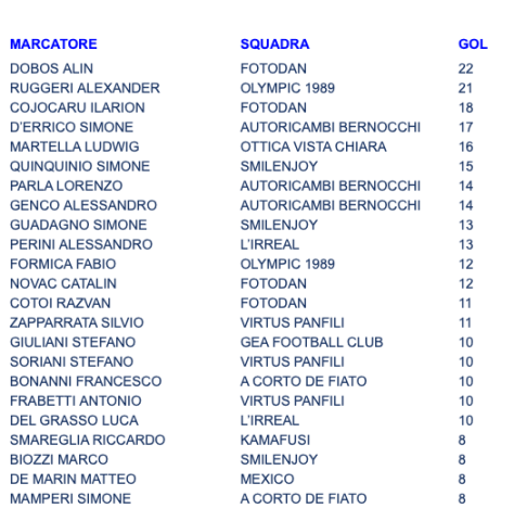 Per quanto riguarda la classifica cannonieri Dobos ha superato Ruggeri ma il nostro bomber ha un match giocato in meno in cui avrà la possibilità di recuperare lo svantaggio con l’attaccante del Foto Dan. Fabio Formica è il secondo miglior marcatore dell’Olympic e occupa l’undicesimo posto in classifica.