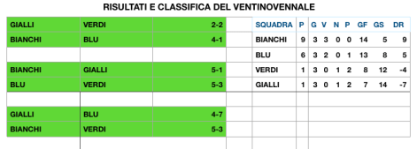 Nel penultimo incontro della serata i Bianchi scendono in campo già sicuri della vittoria finale e probabilmente affrontano i Verdi non la giusta cattiveria permettendo a Manoni di portare in vantaggio i suoi. A metà match però Perrone e compagni si rimettono in sesto e si portano fino al provvisorio 5 a 1 grazie alla doppiette di Rossi e Ruggeri e al gol di Olivieri. Nel finale i Verdi accorciano le distanze ma non completano la rimonta. Formiconi gioca una manciata di minuti con ottimi risultati.