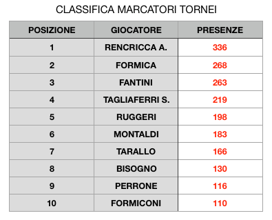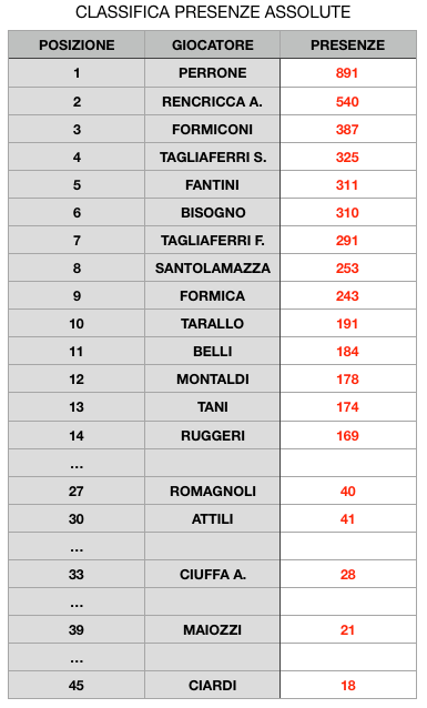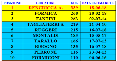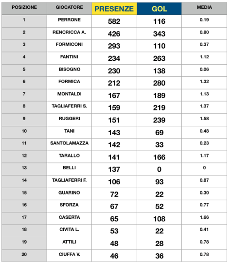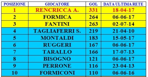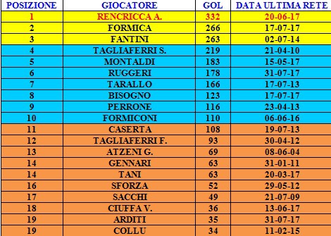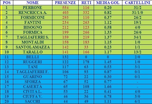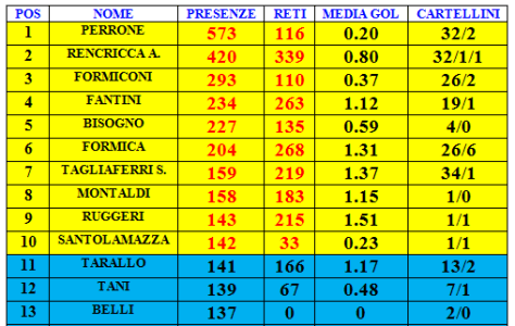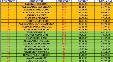 Nell’aggiornamento di domani pubblicheremo l’ultima classifica ovvero quella relativa ai marcatori in gare ufficiali i cui dati sono comunque consultabili nella classifica di oggi sebbene sia in ordine di presenze.