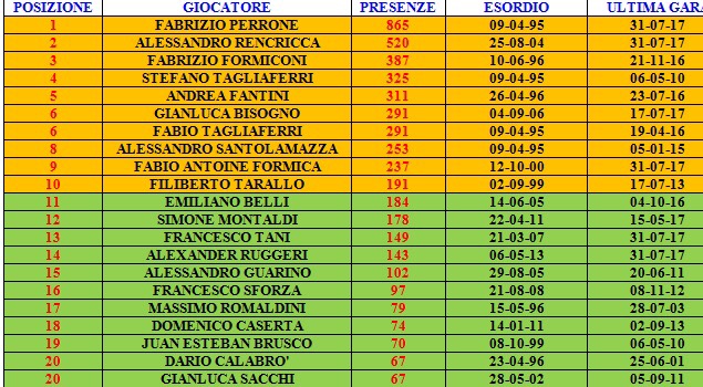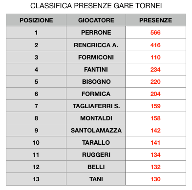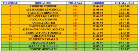 La situazione delle presenze in gare ufficiali è tutto sommato simile a quella delle gare di tutti i tipi: Perrone, Rencricca sono lì in alto molto staccati dagli altri ma in questa graduatoria si aggiunge a loro anche Formiconi.