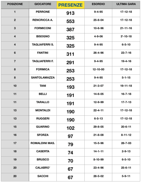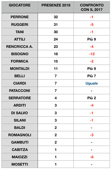 Fantini e Bisogno sono molto vicini tra di loro mentre Formica, al sesto posto, ha ancora molta distanza dal gruppo di testa e dai diretti inseguitori. Tra il settimo e il tredicesimo posto ci sono sette giocatori nel giro di sole 61 presenze ma l’attuale situazione vede privilegiati i titolari Montaldi e Ruggeri che hanno maggiori possibilità di scalare ancora la classifica.