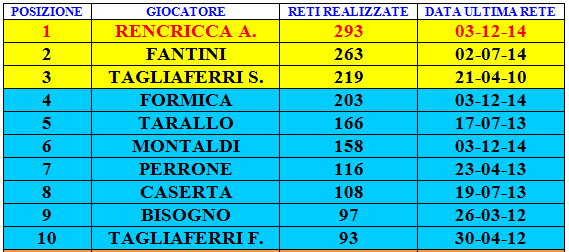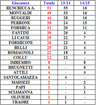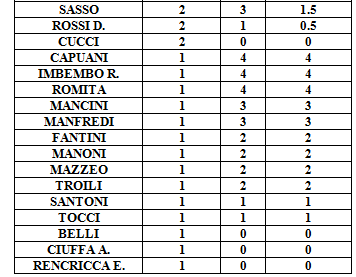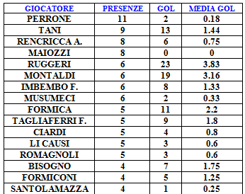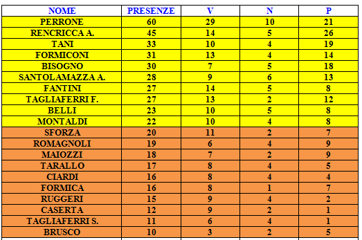 Perrone il più presente poi Tani, Rencricca e Maiozzi i più fedeli in queste sgambate amichevoli. Il re dei bomber è stato invece Ruggeri, come nella scorsa stagione. Ma la classifica continua con altri giocatori che hanno giocato solo alcune di queste partitelle.