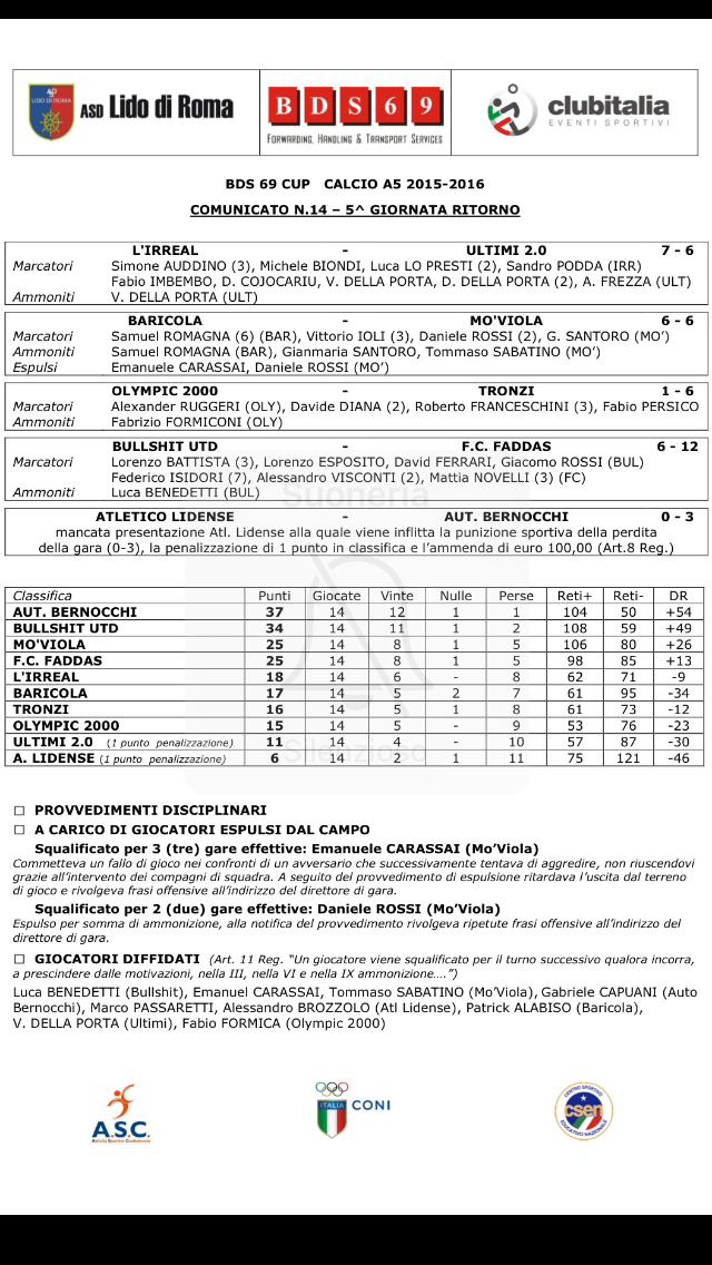 La quindicesima giornata dell’edizione calcio a 5 del Trofeo BDS 69 vede Autoricambi Bernocchi e F.C. Faddas proseguire la loro marcia rispettivamente al primo e al terzo posto in classifica. Le squadre di Cascone e Isidori non devono nemmeno mettere piede in campo a causa della mancata presentazione di Mo’viola e Atletico Lidense. Nelle altre tre gare in programma di questa sesta giornata del girone di ritorno invece si sono viste cose interessanti che renderanno i pronostici della seconda fase piuttosto incerti.